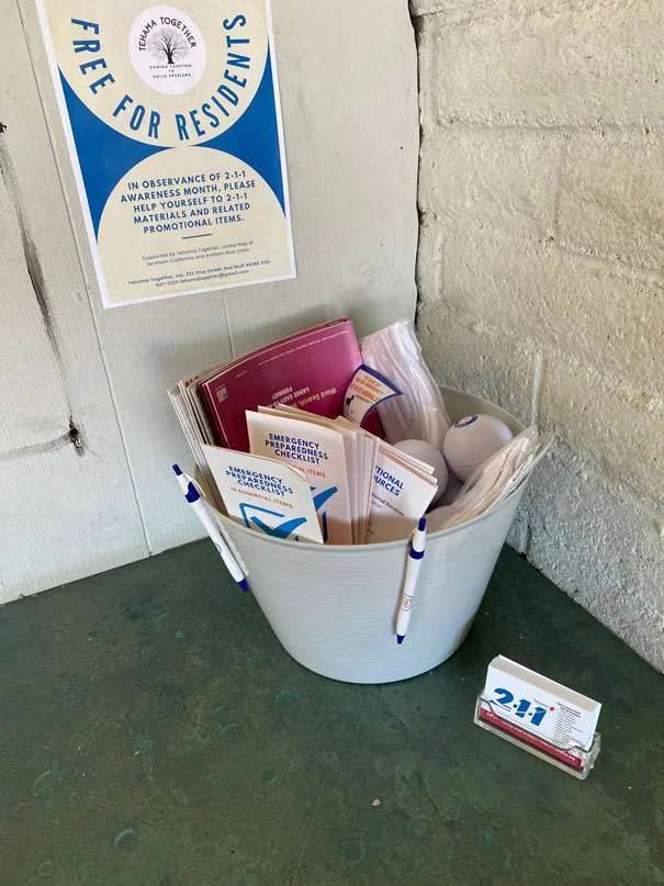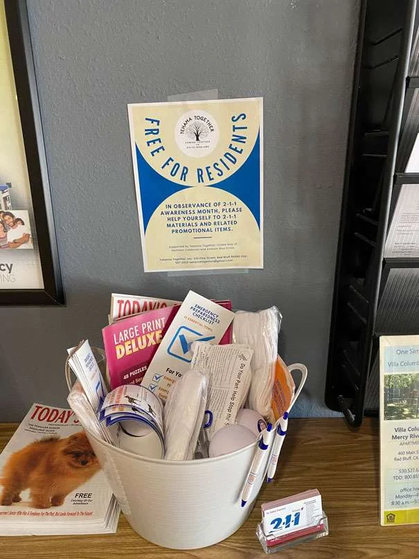 A free live and online 24-7 information and referral service for residents of Tehama County. By phoning 211 or through the 211 website, individuals can receive information regarding food, housing and utility assistance, child care, senior services, drug, alcohol and mental health services, job training and employment programs, crisis hotlines, disaster services and much more.